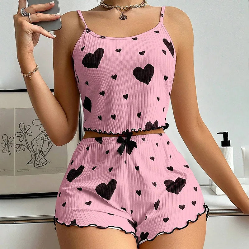 Delicate pleated texture meets playful heart prints in this charming two-piece set. Crafted from soft ribbed fabric with a crisp white base and scattered crimson hearts, finished with sweet scalloped edges and a dainty bow tie.